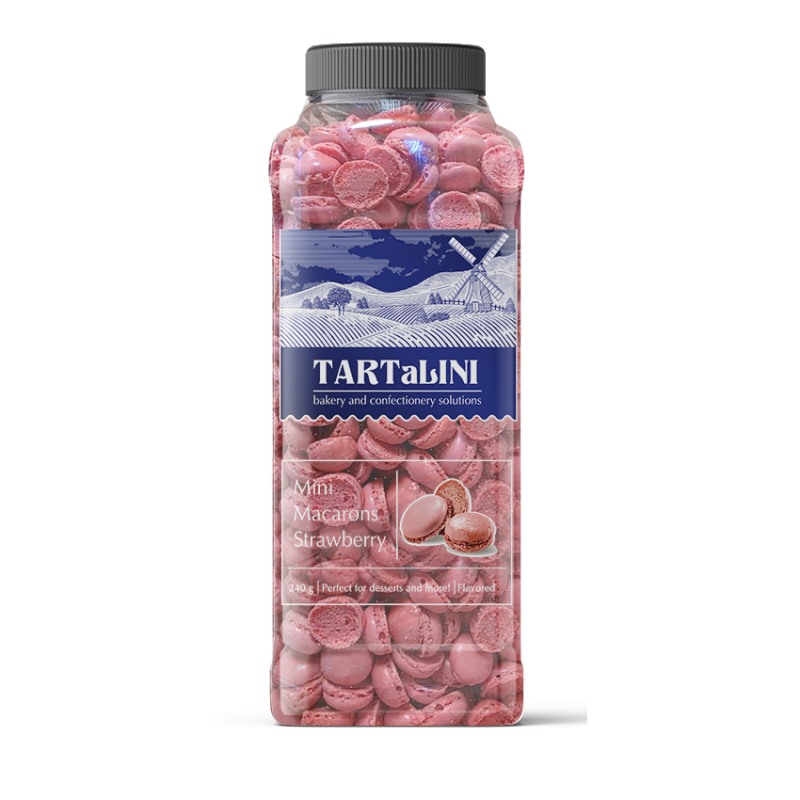 Mini macaron francesi alla fragola. Perfetti per dessert, decorazioni, ecc. Dimensioni: 10 mm. Confezione: 240 g.